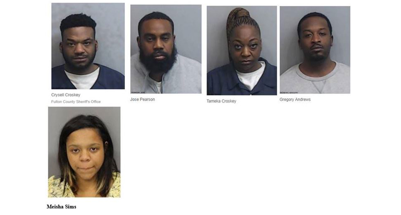 Juan Hernandez Pearson, 38; Temeka Lashon Croskey, 44; Gregory Andrews, 34; Meisha Sims, 31; and Crysell Croskey, 29 (who was already in police custody on other charges), have been charged with multiple felonies. Additional charges are expected.
