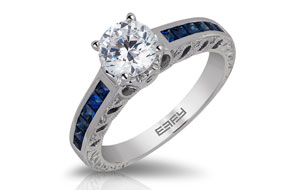 Effy Bridal offers women’s engagement rings and wedding bands in 18-karat white gold with center stones ranging from 0.5 to 1.5 carats. Each piece in the collection features a sapphire in some aspect of the design, and many of the rings have pavé diamonds.
