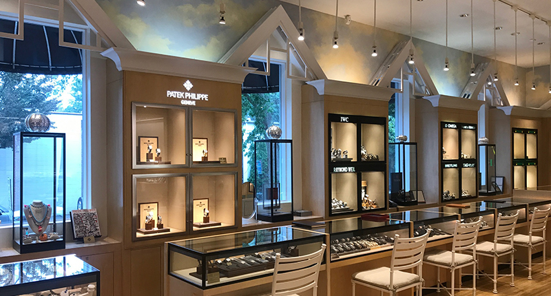 There is one element of modern retail, however, that Roberts does not like to incorporate too much of when designing jewelry stores—electronic screens.