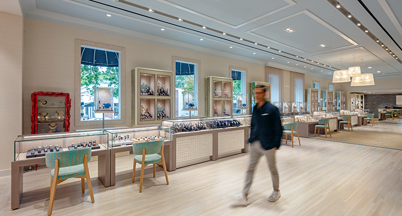 “There’s a very different relationship in the space because from a design standpoint, you have to deal with a lot of locked cases,” FRCH Nelson’s Roberts says when asked about the challenges inherent in a designing a fine jewelry store.
