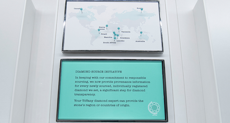 Under the initiative, Tiffany placed small maps in the showcases of its stores worldwide with pins dropped on the countries from which the jeweler sources its stones, along with a plaque explaining the program.