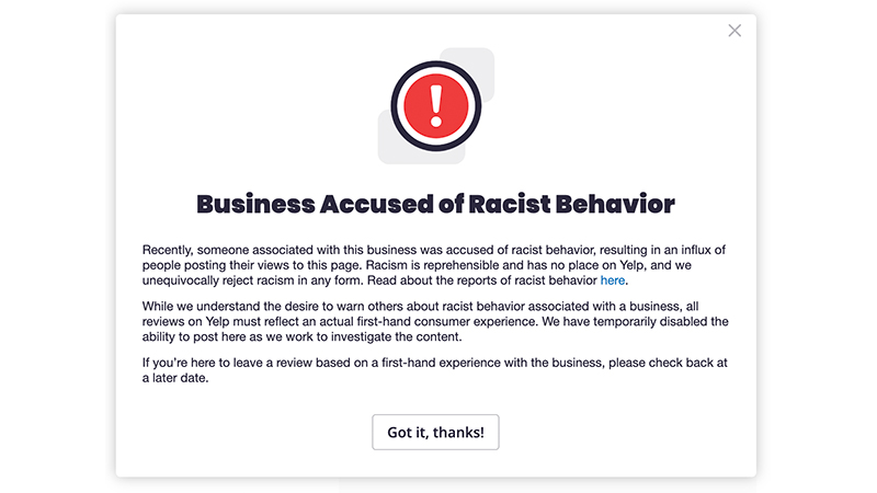 If someone associated with a business is accused of or the target of racist behavior, Yelp will place a Public Attention Alert on the business’ page to let consumers know it might be seeing more reviews because of “increased attention,” temporarily disabling the ability to post as Yelp confirms all content reflects first-hand experiences.