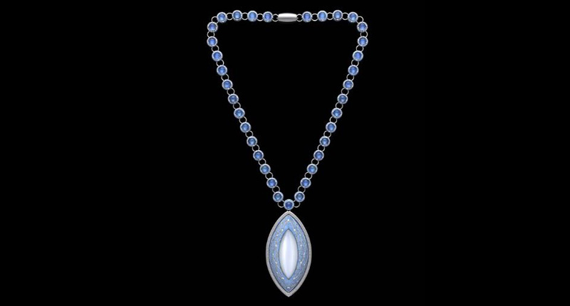 The “Iris” necklace is centered on a 35.63-carat marquise-cut cat’s eye white moonstone from India. There also are 35 round cabochon blue moonstones in the necklace, each weighing 0.50 carats, and 164 ideal-cut diamonds weighing 1.20 carats total, ranging from D to F in color and VVS to internally flawless in clarity.