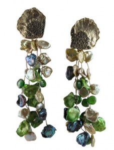 Elizabeth Olsen, a budding actress and the younger sister of celebrity twins Mary-Kate and Ashley, wore Joan Hornig’s 18-karat Shell earrings with green and blue Keshi pearl drops (below, $2,100) to Comic-Con on July 20 in San Diego.