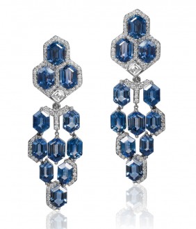 Goshwara’s detachable Hexagon earrings are 18-karat white gold with natural sapphires and diamonds ($48,000), from the JIC preview.