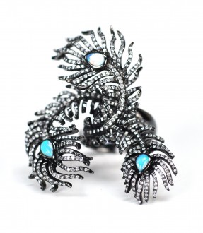 Frank Caballero’s 18-karat white and yellow gold ring is set with a 9.11-carat round Madeira citrine surrounded by diamonds ($6,000), from the American Gem Trade Association table at the JIC preview. The person modeling the ring is none other than our lovely Editor-in-Chief Michelle Graff, who may have missed her calling as a hand model.