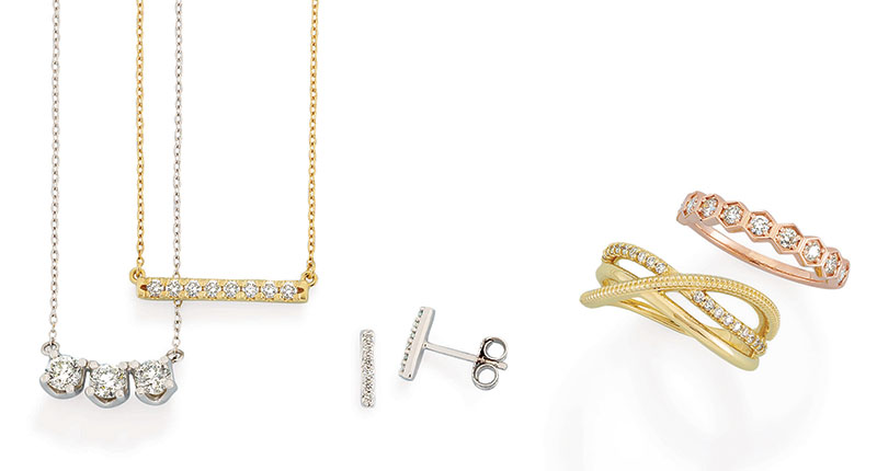Stuller is among the major industry suppliers that have begun selling lab-grown diamonds, both loose and set into jewelry, in recent years. Pictured here are pieces in its “Modern Brilliance” collection of lab-grown diamond fashion jewelry.