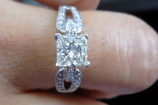 This princess-cut engagement ring is currently for sale on HYSTR as of Monday morning, listed at $4,750. The center stone is 1.07 carats, I color, VS1 clarity, with 3.06 total carat weight. (Photo courtesy of HYSTR)