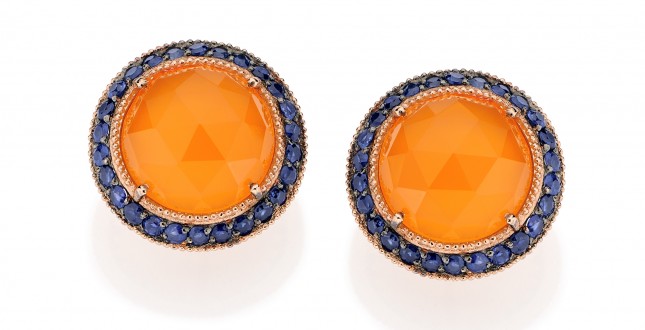 Carla Amorim’s 18-karat rose gold “Mango” earrings feature orange carnelian agate and blue sapphires, seen at the Vicenzaoro Spring show in Vicenza, Italy