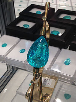 On left, an inside shot of the booths under the tent of the GJX show. I also saw this Paraiba tourmaline, pictured right, inside GJX and couldn’t walk away without snapping a photo.