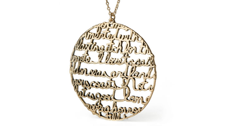 Eventually, Out of Print expanded into costume jewelry, though the interpretations are much less literal: Holden Caulfield’s hat from J.D. Salinger’s The Catcher in the Rye, Scout and Boo feathers from To Kill a Mockingbird, a necklace containing lines from Moby-Dick.