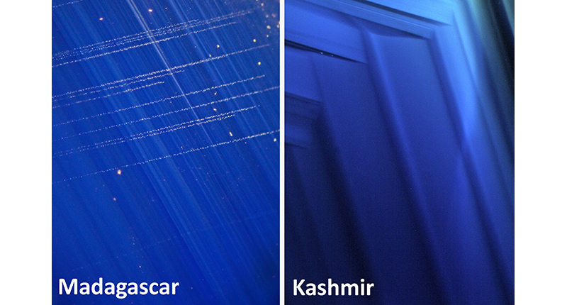 And while the sapphires coming from Madagascar do have a “Kashmir-like” visual appearance--with a subtle and fine “milkiness” that results in a velvety blue color typical of those that come from Kashmir--there also are a number of telling factors that distinguish goods from the two sources, including differences in clarity, growth zones, color zones and variation in the zircon crystals that appear inside.