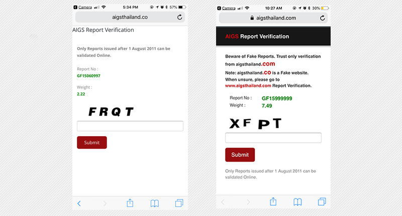 Pictured at left is a screenshot taken after scanning the QR code on a fake AIGS report; at right is a screenshot taken after scanning the QR code on a genuine AIGS gemstone report. Notice the difference in URLs at the top; the fake reports are directing users to AIGSThailand.co instead of AIGSThailand.com.