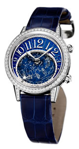 The watch has an 18-karat white gold case with a diamond and lapis-lazuli dial. On the dial, there is a zodiac calendar that shows the positions of the constellations at any point in the year, with the watch’s movement rotating the disc once every 23 hours, 56 minutes and 4 seconds.