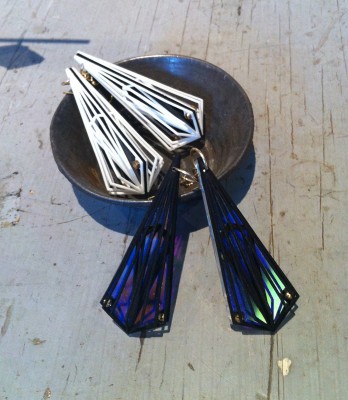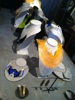 A table full of Sarah Angold jewelry; Angold’s 3D printed earrings