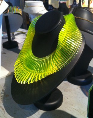 Angold’s “Nahal” necklace, made of laser-cut acrylic and brass with gold clasps; another laser-cut acrylic necklace