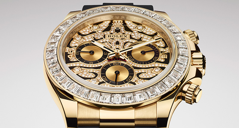 In addition to the diamond-pave Day/Date 36 with sapphire hour markers, there was the Cosmograph Daytona with 36 trapeze-cut diamonds in the bezel and 243 pave diamonds on the black lacquer dial, designed to mimic animal print and is reminiscent of the leopard print Cosmograph dubbed “The Mombutu,” after the hats worn by Mobutu Sese Seko, the former dictator of Zaire (now the Democratic Republic of Congo), who died in 1997.