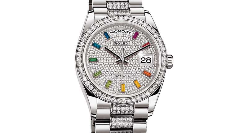 Rolex also introduced Day/Date 36 models with green and brown ombre dials—dials that are slightly darker on the edges but lighten toward the center, a trend seen across brands at Baselworld 2019—and a diamond-pave dial version with colored sapphire hour markers.
