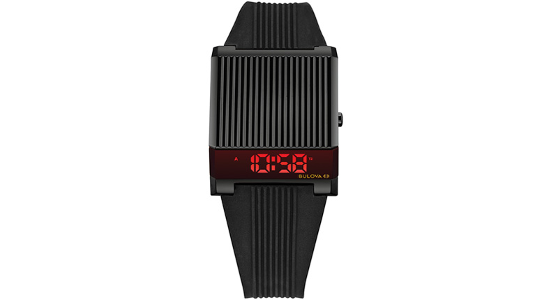 The rebooted Computron is part of Bulova’s Archive Series. It is available in an all gold-plated case and bracelet version with red LED display ($395), as well as in black ion-plated with rubber strap and stainless steel with blue LED display, both $295.
