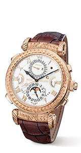 Some of the 47 mm watch’s other complications include a grande and petite sonnerie, minute-repeater, a four-digit year display, movement power-reserve indicator and two chimes: an acoustic alarm that strikes the alarm time, and a date-repeater that sounds the date on demand.