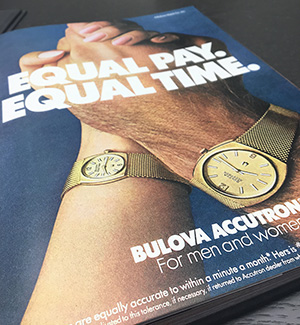 The watch brand also included among its firsts in the book its support of the feminist movement, pointing to its “Equal Pay. Equal Time.” ad (pictured below) that ran in the 1970s when, much like today, the gender pay gap was the subject of much discussion amid another push for passage of the Equal Rights Amendment (ERA), which remains unadopted to this day.
