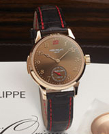 It is the first time a personalized pink gold Ref. 3939 with a special brown dial and red numeral has appeared at auction, Antiquorum said. The lot is accompanied by a fitted box, additional case back and certificate of origin.