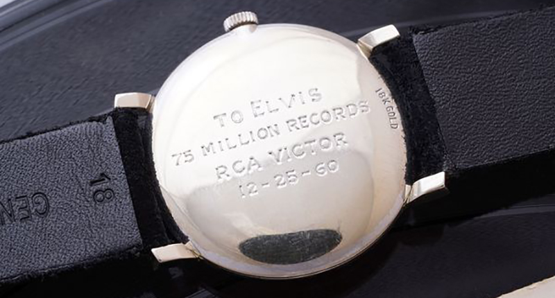 It was there RCA presented Presley with the 18-karat white gold and diamond Omega wristwatch, which was purchased at Tiffany & Co. The case back, as seen below, is inscribed: “To Elvis, 75 Million Records, RCA Victor, 12-25-60.”
