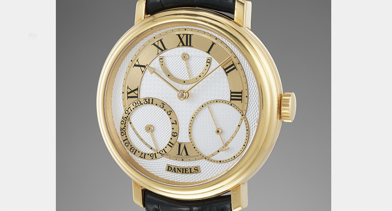 He created it entirely himself in 1987. According to Phillips, it’s the only Daniels timepiece to feature an instantaneous perpetual calendar with retrograde date and minute repeater, both mechanisms made to his own design.