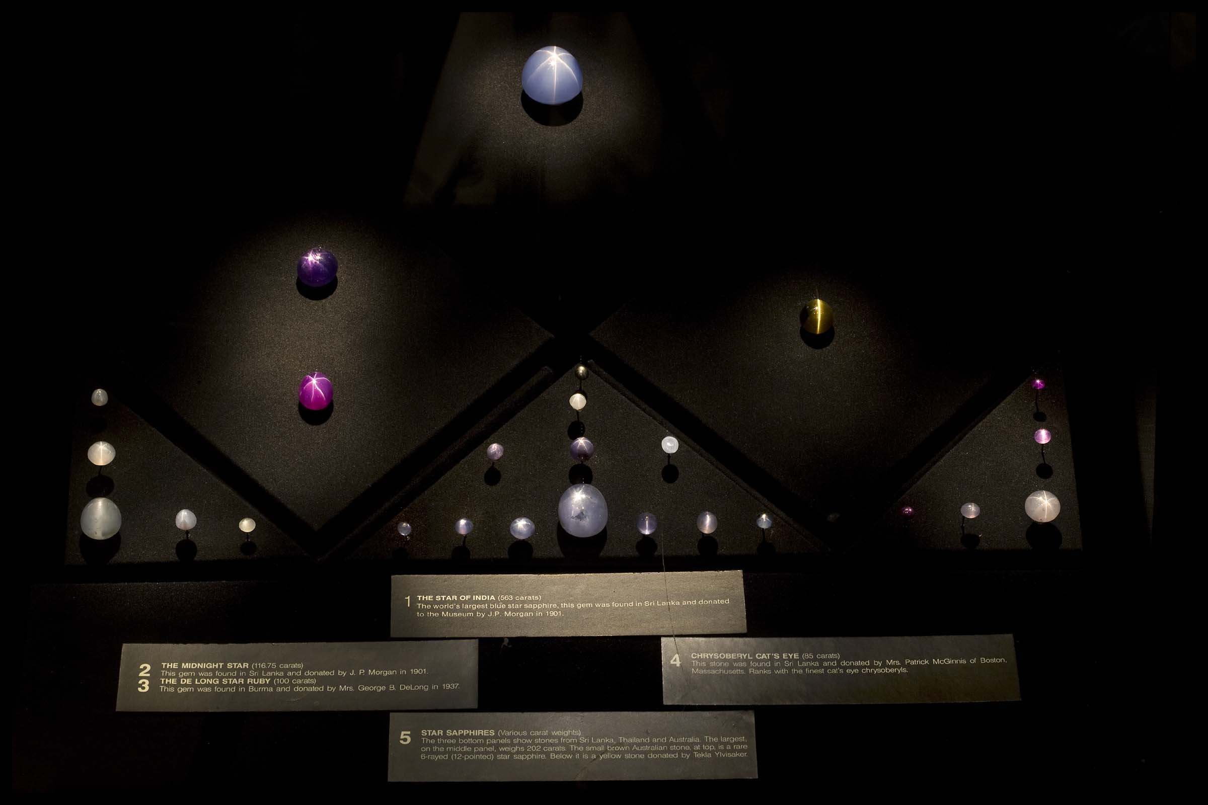 The exhibit is divided into two parts--the Harry Frank Guggenheim Hall of Minerals, a collection of hundreds of mineral-bearing specimens from around the globe; and the Morgan Memorial Hall of Gems, a collection of precious and ornamental stones featuring both uncut, rough pieces and cut, polished gems.