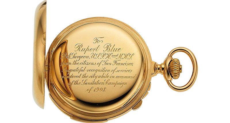 It’s very timely, then, that an 18-karat gold Patek Philippe pocket watch owned by the doctor who helped guide the U.S. through that pandemic more than a century ago will go up for auction next month at Heritage Auctions in Dallas.