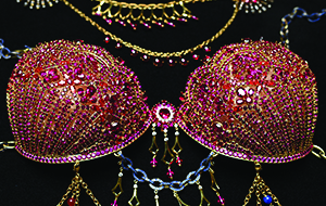 Both are valued at $2 million each and together are adorned with more than 16,000 gems total. Accompanying the bras are arm, leg, stomach and neck pieces of fine gemstones, strung together on 18-karat gold chains.