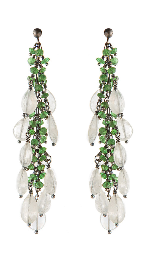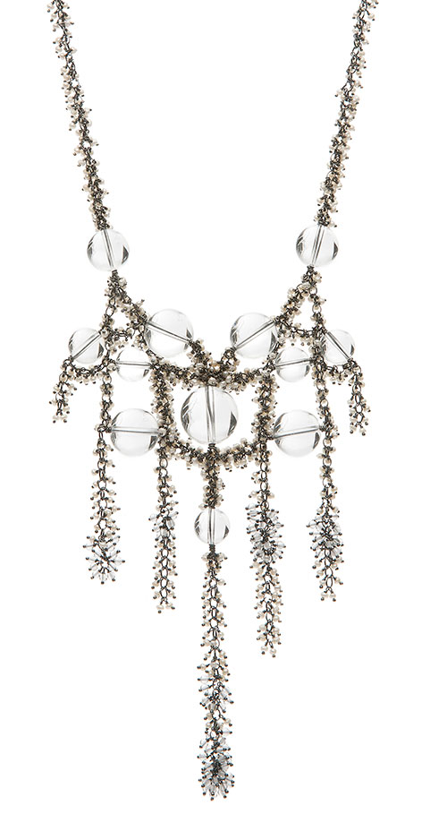 This is the “Venus” necklace, 174.85 carats of rock crystal spheres, seed pearls and oxidized sterling silver ($4,420). Michelle’s inspiration was the burst of water and energy as Botticelli’s Venus emerged from the sea.