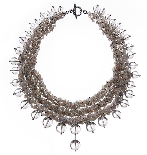 The Undina Collection’s “Luna” necklace, inspired by the moon, yes, but more specifically, calm ocean water at night and its connection with the moon, Michelle said. This 18-inch necklace is sterling silver with faceted, tumble-polished labradorite rondelles. There are 1,000 labradorite stones on this necklace (total carat weight, 676) along with 676 carats of rock crystal spheres,