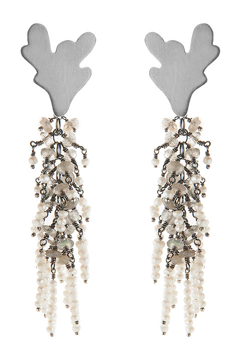 The “Galena” earrings also have labradorite rondelles along with seed pearls and oxidized sterling silver ($1,070). Galene is the Greek goddess of calm seas, and coral can grow only in tranquil waters.