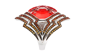 The first suite in the collection is the plumage-inspired Magnipheasant, which offers 18-karat white and yellow gold pieces with diamonds and vibrant gemstones including amethyst, citrine, topaz, opal, garnet and sapphire. The pieces in this line are tipped with black diamond pavé to emulate the pheasant’s feathers.