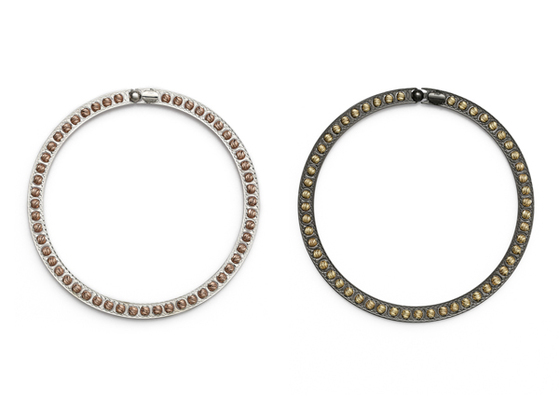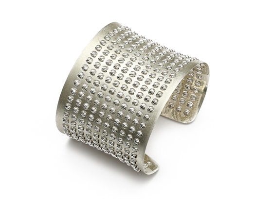 At left is Athomie’s sterling silver triple-row cuff with 18-karat chocolate gold plating and silver diamond-cut beads plated in 18-karat yellow gold ($348) and the brand’s single-row silver cuff with diamond-cut silver beads, all plated in 18-karat yellow gold ($298).