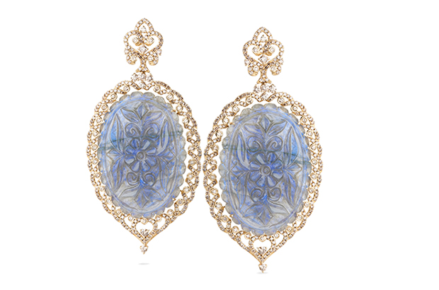 Bright Cobalt and Cognac. Bochic’s 18-karat yellow gold earrings with sapphires and diamonds ($23,450)