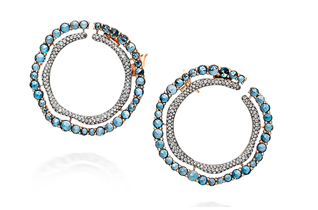 Bright Cobalt. Astley Clarke’s 18-karat rose gold “Fao” hoop earrings feature London blue topaz and diamonds ($12,750).