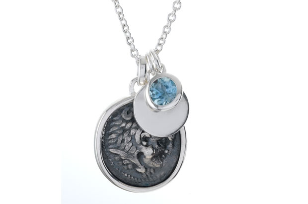 This “Vivace” sterling silver chain necklace by 1884 Collection features an Alexander the Great coin, sterling silver disc and blue topaz pendant ($840).