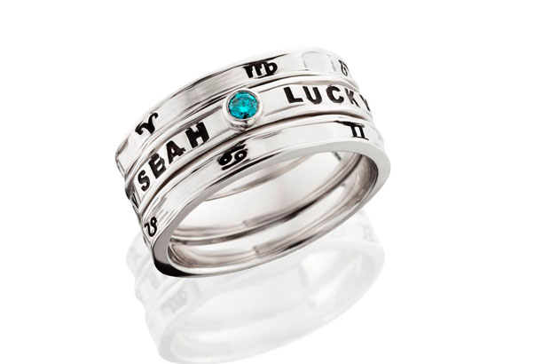 These mix-and-match stackable sterling silver rings by Seah include the unisex “Lucky” ring with a round treated blue diamond (middle), and two “Zodiac” bands with six ancient zodiac signs on each band (top and bottom). The set shown here retails for $495.