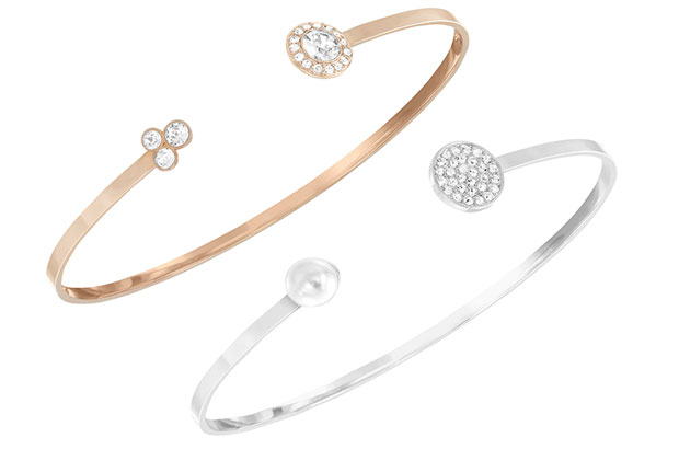 Also new for spring 2015 from Swarovski is this “Cute” set of skinny bangles in rhodium and rose gold plating with clear crystal and faux pearl embellishments. Skinny bangles that are worn open-side-up with end-cap embellishments are on-trend. Swarovski.com