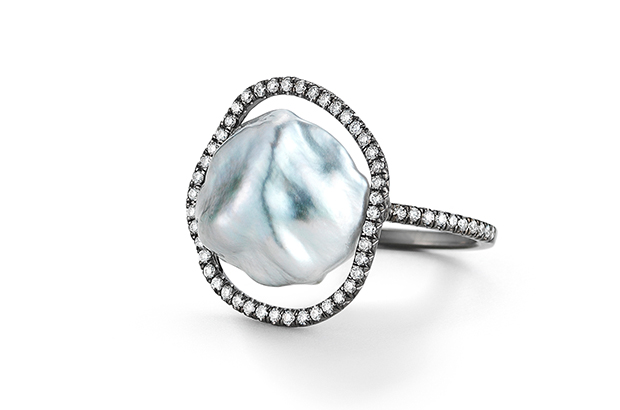 Stranger also designed this “Pearl Equator” ring with diamond pavé accenting the pearl, made in 18-karat blackened white gold. It retails for $5,300. SavannahStranger.com