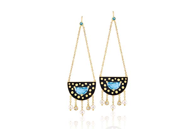 Holly Dyment’s “Moon” earrings feature green and black enamel with blue topaz, white diamonds and pearls made in 18-karat gold. They retail for $6,945. HollyDyment.com
