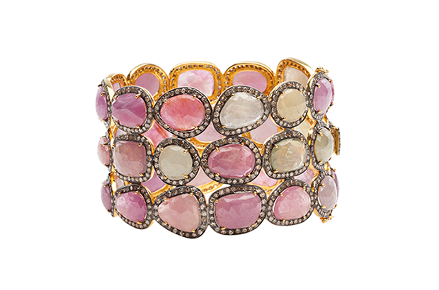Craft created this bracelet using the common pastel colors for spring, featuring colored sapphires and champagne diamonds, made in black rhodium-plated silver and 18-karat yellow gold. It retails for $16,000. LaurenCraft.com