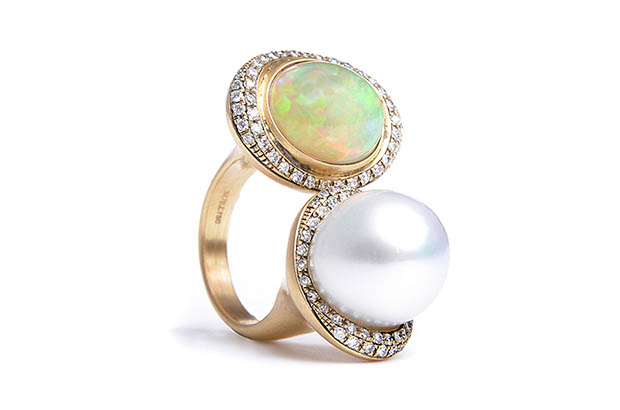 Suel’s one-of-a-kind double ring boasts an Ethiopian opal, an Australian South Sea pearl and diamonds. It retails for $12,790. SuelJewelry.com