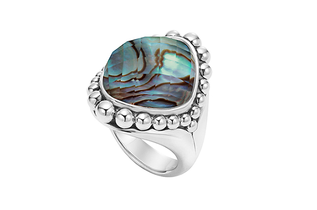 New for 2015 from Lagos’ “Maya” collection is this abalone doublet and sterling silver ring, which retails for $450. Lagos.com