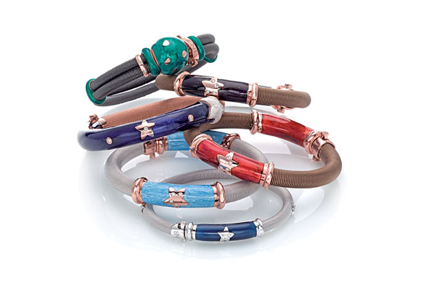 Seen in bracelets, rings, necklaces and earrings, designers commonly married white and rose gold with white diamonds or colored gemstones. White and yellow gold combinations also were prevalent, with one brand even adding colored enamel on top of its mixed metals.