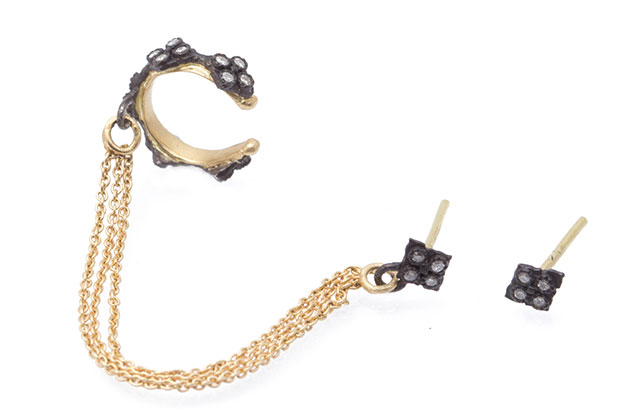 This blackened sterling silver and 18-karat yellow gold multi-chain ear cuff and post from Armenta’s “Old World” collection is set with white diamonds. It retails for $1,590. Armenta.com