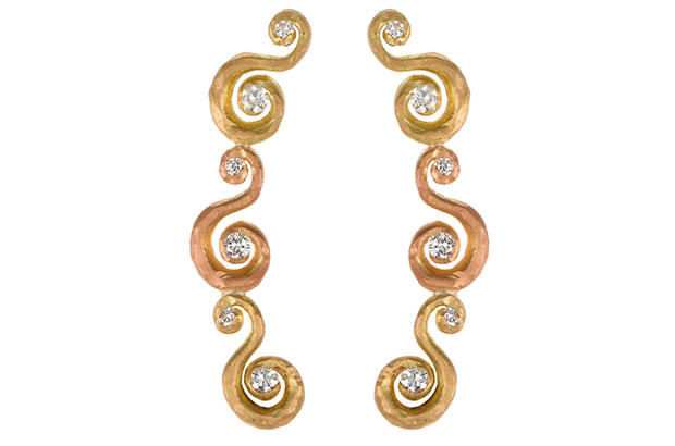 These arabesque ear climbers by Pamela Froman are 18-karat yellow and pink “crushed” gold set with 0.35 carats of diamonds ($2,860). PamelaFroman.com