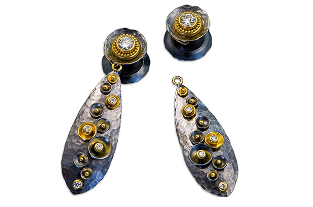 Zaffiro’s Etrusco “Nebula” earrings have removable drops. The center stones are 1.50 carats total weight while the smaller diamonds total 0.32 carats, set in granulated 22-karat yellow gold with oxidized sterling silver ($9,350). ZaffiroJewelry.com